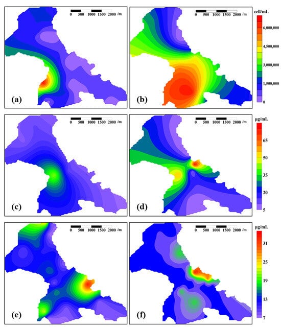 Genomic sequencing revealed a field test biogeographic gradient where the proximal pilot test area exhibited the highest microbial diversity, with progressive diminution at increasing radial distances (Figure 2)—a spatial pattern that is consistent with the biomass distribution trend (Figure 7). In the former pilot test area, 26 microbial genera were detected, while only 15 genera were identified in the distal southeastern section of the B9 Reservoir. Additionally, 20 genera were observed in the field test area and its adjacent regions (Figure 4). Notably, the former two regions exhibited significantly higher proportions of unique microbial genera (non-overlapping with other regions) at 61.5% and 66.7%, respectively, whereas the field test area and its vicinity showed fewer unique genera (15–30%) (Figure 2).