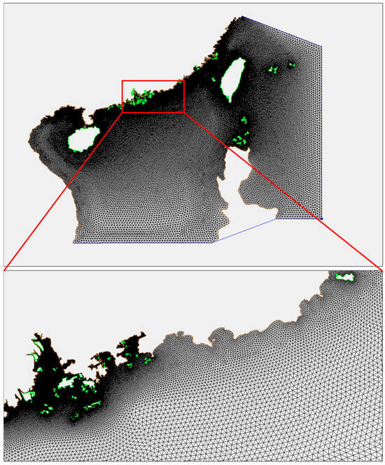 For wave modeling in the study area, an unstructured triangular grid was implemented with local refinement in key regions. The computational domain encompasses the South China Sea, Beibu Gulf, and Taiwan Strait, spanning 105.63° E to 127.66° E and 11.37° N to 28.41° N. The mesh system consists of 89,082 nodes and 170,295 triangular elements, with a spatial resolution varying from 200 m in the study area to 20 km at the open ocean boundaries. This multi-scale grid configuration ensures computational efficiency while maintaining high resolution in areas of interest. The wave spectrum was discretized into 36 directional bins and 24 frequency bins, covering a range from 0.04 Hz to 1 Hz. The model parameterization configuration followed the study by Jia et al. (2023) [26]. The Model parameterization configuration in the SWAN model is shown in Table 3.