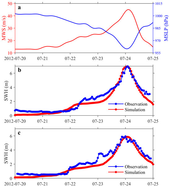 Figure 4 displays the development of Typhoon Vicente’s intensity (in 10 m MWS and MSLP) and compares the SWAN simulated SWH with buoy observations (from B01 and B02) during the typhoon period from 20 July 2012 to 25 July 2012. Typhoon Vicente was generated on 20 July 2012 over the Western North Pacific (WNP), entered the SCS on 22 July, and made landfall in Guangdong, China, on 24 July. The maximum typhoon intensity attained 45 m/s in 10 m MWS and 960 hPa in MSLP (Figure 4a). As revealed in the figures, the SWAN model demonstrates remarkable accuracy in simulating SWH in comparison with observations (Figure 4b,c) during typhoon development (Figure 4a). The simulated SWH values of 6.94 m at B01 and 5.86 m at B02 show excellent correspondence to the observed measurements of 6.97 m and 5.93 m, respectively (Figure 4b,c). Temporal analysis reveals that the observed SWH exhibits pronounced oscillations, potentially attributable to the complex interplay of submesoscale oceanic processes and atmospheric forcing mechanisms. Furthermore, the comparative analysis between buoy locations reveals a distinct spatial gradient in wave energy distribution, with wave intensities at the proximal station B01 (near the cyclone center) exceeding those at the distal station B02 by approximately 18.4% (Figure 1 and Figure 4b,c).