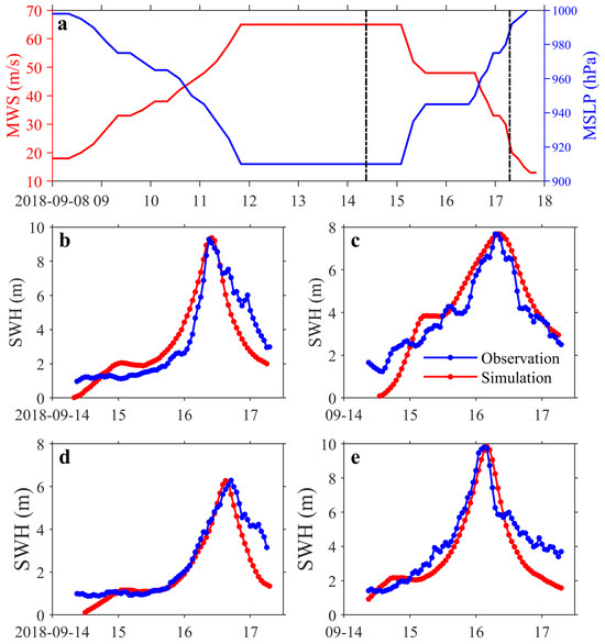 (a) Temporal evolution of Typhoon Mangkhut’s intensity and the comparison of the SWH between simulations and observations from buoy (b) B01, (c) B03, (d) B04, (e) B05.