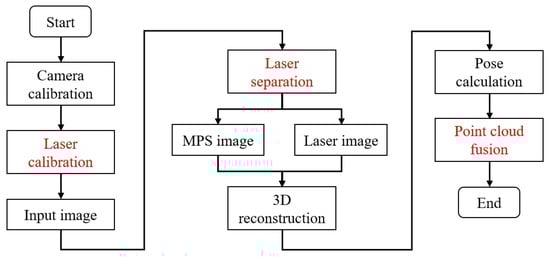 In this section, we first propose a laser (laser plane) calibration method that fits straight lines. Secondly, we provide a laser line separation solution for multispectral images containing laser lines. Finally, we use weighted data fusion in mobile reconstruction to solve the problem of data redundancy. The overall 3D reconstruction flowchart is shown in Figure 1, where the steps marked in red denote our three different innovations.