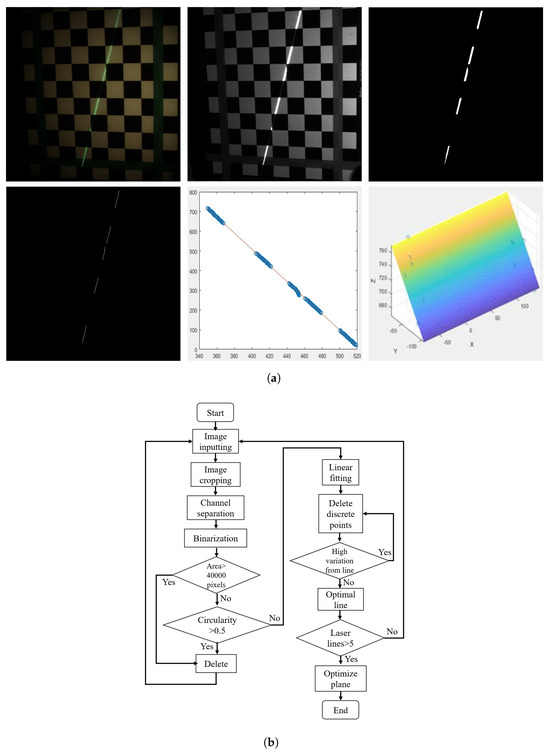 (a) The first line is the captured image, green channel image and binary image, the second line is the refined image, fitted line and laser plane. (b) Workflow for obtaining the laser plane through area selection and linear fitting.