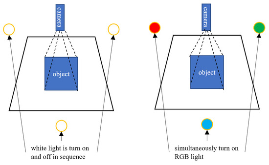 The multispectral photometric stereo (MPS) algorithm is a variation of the traditional photometric stereo algorithm, which replaces the three white lights in the traditional photometric stereo with far-point light sources of three primary colors: red, green, and blue. Multispectral photometric stereo is essentially a form of photometric stereo with three primary color (R, G, B) light sources. It replaces the time-division multiplexing (multiple single light illumination) used in traditional photometric stereo with frequency-division multiplexing (single multi-light illumination). The difference between PS and MPS is shown in Figure 4. Compared with traditional photometric stereo algorithms, the dynamic and real-time performance of single image reconstruction using multispectral photometric stereo can be used in the reconstruction of video sequences. Assuming that the object conforms to the Lambertian model, the brightness value of any point on the object in the i-th (i = 1, 2, 3, representing red, green, and blue, respectively) channel is expressed as: