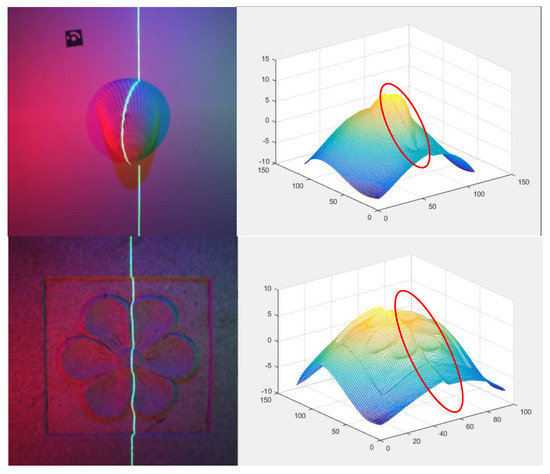 In the process of using images with laser lines and multispectral features for 3D reconstruction, we found that some primary light sources contain the same or similar spectra as the laser lines in the image, which makes it difficult to extract laser lines through region-based image segmentation and morphological operations. In addition, the area illuminated by the laser line on the object under test will only display the color of the laser line, losing the pixel information of the corresponding color and brightness of the multispectral light source in this area. When performing direct (uncorrected) 3D reconstruction with a three-channel separation, it will cause segmentation phenomena (Figure 5), where the area marked by a red ellipse shows the unevenness of the texture or pattern caused by the reconstruction under the influence of the laser line. The mutual influence between laser and multispectral light sources greatly reduces the reconstruction performance, which puts forward another serious challenge to consider. In order to complete the reconstruction of multispectral photometric stereo, it is necessary to remove the influence of laser lines on multispectral images while retaining the laser line information.