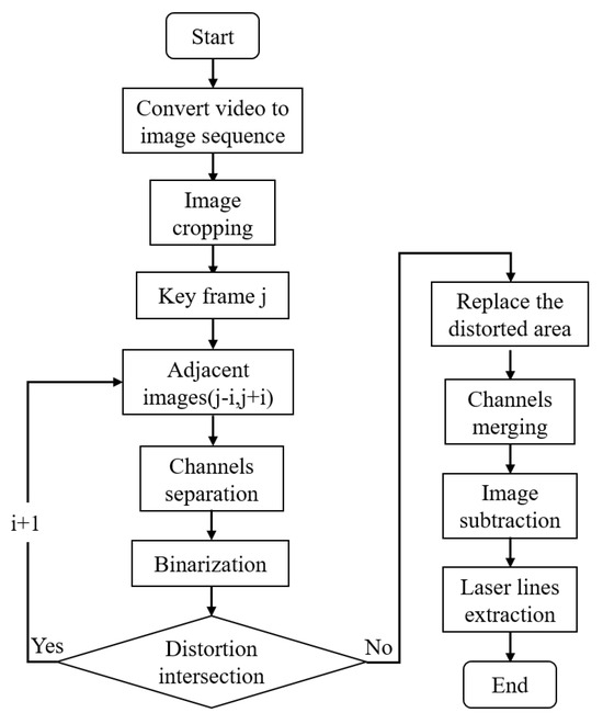 - Finally, the pixel values of the corresponding area (distortion area of the keyframe j) before image binarization are overlapped and evenly divided, then replaced with the distorted area of the keyframe j that has not been binarized, making it a new keyframe without a distortion area. The restored keyframe image is directly subtracted from the original keyframe image j in terms of pixel values to obtain the laser line image. The above steps are repeated until the laser line disappears from the object to be measured.
