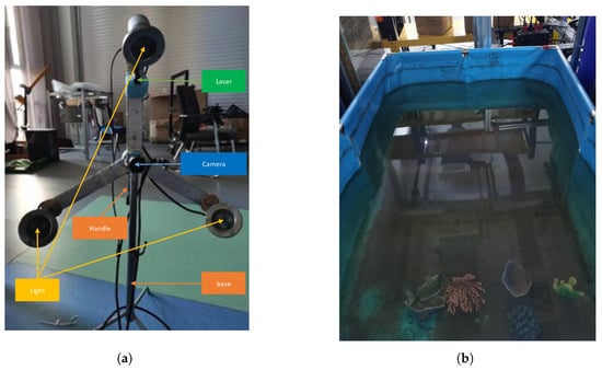 In our self-made mobile equipment, the camera model is IDS UI-5240CP-C-HQ (IDS Imaging Development Systems GmbH, Obersulm, Germany), the light source model is Aozipudun AZ-SDD03-01 (Zhongshan Minfeng Lighting Co., Ltd., Zhongshan, China), and the linear laser model is Desheng DS2090 (Changshu Desheng Optoelectronics Co., Ltd., Changshu, China). We also built a pool for underwater experiments and laid sediment on the bottom of the pool to simulate the underwater environment under real conditions. The self-made equipment and experimental water tank are shown in Figure 7.
