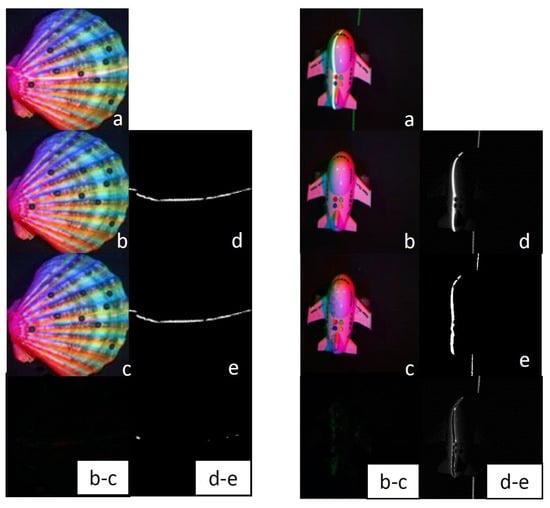 After processing the difference between the two real objects, it can be concluded that there is almost no difference between the predicted image obtained by our method and its corresponding ground truth. Especially for the multispectral images of the shell, the processing effect of laser lines is very obvious. The difference b-c in the multispectral images is almost black everywhere, making it difficult to distinguish the position and color of the colored areas. Moreover, the difference in laser lines d-e only shows some pixel shifts. Although the estimation performance of the laser line in the multispectral image of the airplane object is not as obvious as that of the shell, the difference b-c in its multispectral image is not significant either, only a few vertical green lines appear, and the difference d-e in the laser line only exists in the outer contour of the laser line (the central area is black), indicating that the predicted laser line and its ground truth only differ in thickness, where the central area overlaps. Therefore, our proposed method is feasible and can efficiently exploit a multispectral image with laser lines to a multispectral image without laser lines and an accurate laser line.