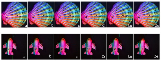Similarly to Figure 9, the label is set in the lower right corner of the predicted image results, where a is a multispectral image with laser lines, b is a multispectral image without laser lines (GT), and c is the multispectral image predicted by our algorithm. Cr is the effect image of filling holes with redundant information, Lu is the effect image obtained by minimizing the tensor kernel norm, and Ze is the effect image of feedback iterative repair. The default image resolution is pixels.