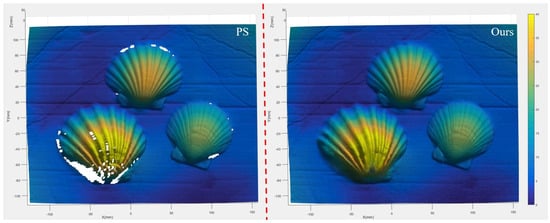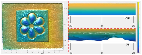 Traditional underwater photometric stereo cannot perform mobile reconstruction, so it is impossible to reconstruct the side information of the stone slab and may result in voids, as shown in Figure 11 and Figure 12. The angle of light source illumination and the obstruction of surface undulations of objects are inherent problems in static photometric solids. The advantage of our proposed method is that it can dynamically scan and solve the problems of side reconstruction and reconstruction with holes.