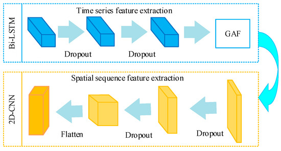 - This paper utilizes Bi-LSTM networks to effectively extract emphasize historical features from bearing multi-source time series data. Additionally, a 2D-CNN based on the Gramian Angular Fields (GAF) is employed to capture intricate deep spatial series features. A self-attention mechanism fuses multi-source spatiotemporal feature information to obtain multi-source fusion features. Multi-source spatiotemporal features are extracted jointly for the first time, and a self-attention mechanism is introduced to integrate multi-source spatiotemporal features dynamically to solve the problem of multi-source data redundancy and conflict. The extracted bearing features provide deep multi-source spatiotemporal series features for the model to improve the model’s performance.