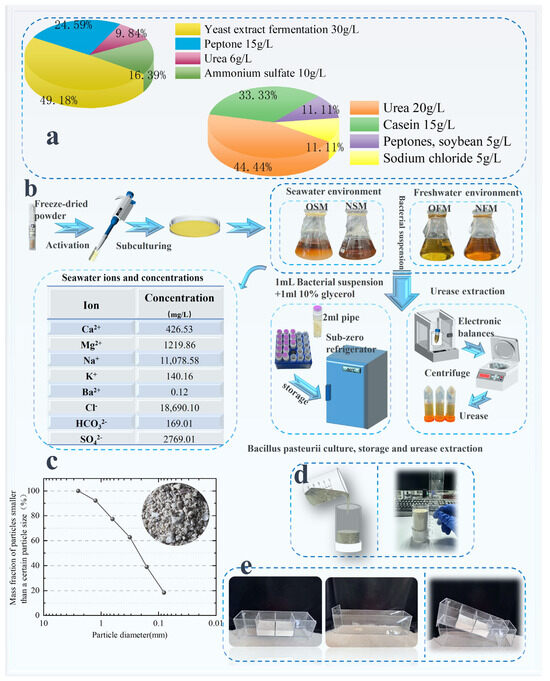 Summary of materials: (a) composition and proportions of the liquid culture medium; (b) activation, subculturing, and cultivation process of Sporosarcina pasteurii in different culture media; (c) particle size distribution curve of the calcareous sand; (d) reinforced experimental acrylic transparent hollow tube; (e) experimental model of sink scouring.