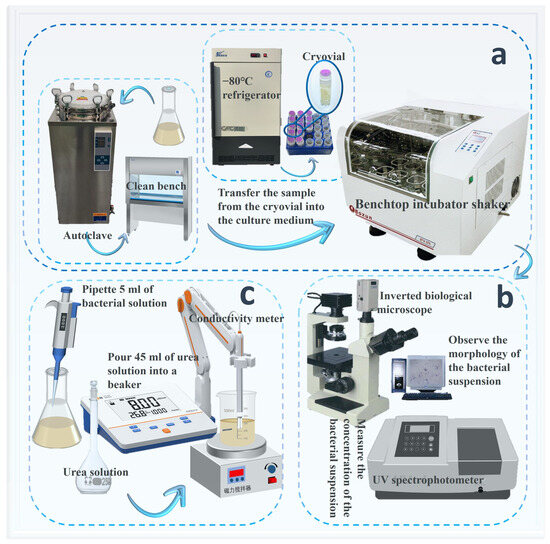 Measurement of urease activity: The conductivity meter was used to measure urease activity by monitoring changes in conductivity resulting from urea hydrolysis. This process is illustrated in the flowcharts in Figure 2b,c, which detail the steps from bacterial cultivation to morphological observation and urease activity measurement.