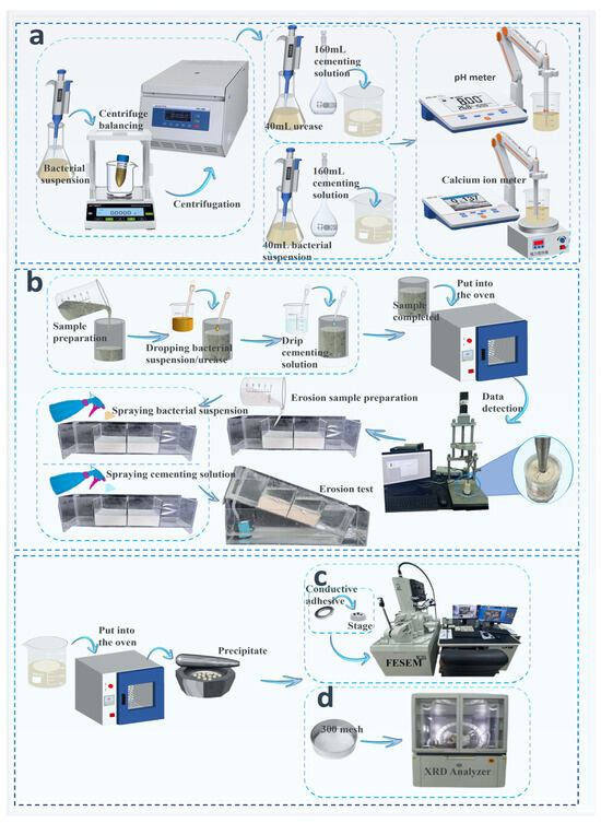 The experiment investigated the mineralization reaction process of bacterial solution, urease, and cementation solution over 72 h to deeply explore the reaction mechanism, with the precipitation formation time set at 4 h. The specific test scheme is detailed in Table 2 and Table 3, and the flow chart is shown in Figure 3a.