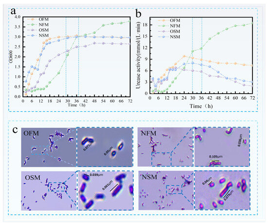 The curves of the change in bacterial solution concentration over time under different culture conditions are shown in Figure 4a. According to the figure, OFM and NFM, under deionized water conditions, both grow in the logarithmic phase in the initial stage. The growth of OSM under seawater conditions is delayed in the initial stage. Seawater likely inhibits the growth of the bacterial solution, and the bacteria need to adapt to the environment before showing growth. In the initial stage, the value of NSM under the seawater condition increases more rapidly than that under the deionized water condition, and then there is a brief decrease. This may be because the culture medium provides more nutrients and minerals, promoting the growth of bacteria. In addition, the extra minerals, salts, and trace elements provided by seawater may promote Bacillus pasteurii’s growth, making it grow more rapidly in the culture medium containing seawater [56]. The subsequent brief decrease may be due to the consumption of nutrients or the accumulation of metabolic waste, resulting in a temporary decrease in the concentration of the bacterial solution. Subsequently, the concentration of the bacterial solution gradually rises and reaches a stable state, indicating that Bacillus pasteurii has gone through the stationary and decline phases.