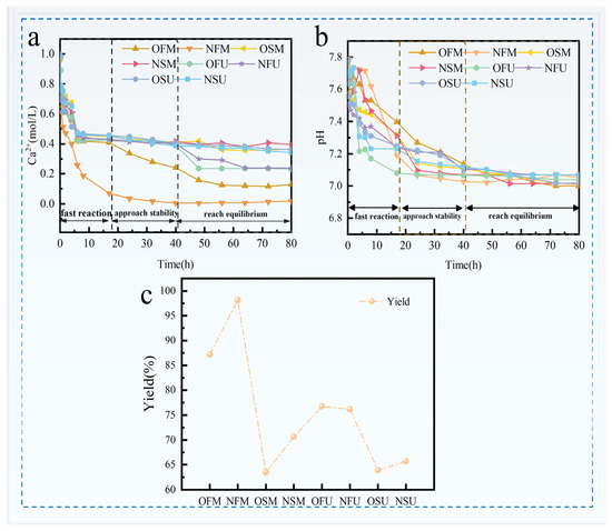 (2) By detecting the changes in Ca2+, pH, and the precipitation formation rate over time during the mineralization reaction process, it was found that under the condition of the improved NH4-YE medium in the freshwater environment, the mineralization reaction time is rapid, the precipitation rate is high, and the amount of precipitation is increased by at least 1.26 times. The reaction is completed within 4 h.