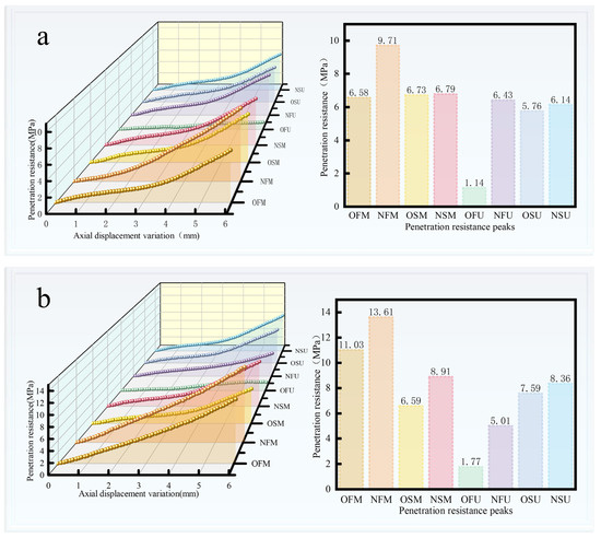 In order to study the surface reinforcement effect of Bacillus pasteurii on calcareous sand under different culture conditions, a penetration test was carried out on calcareous sand with mixed particle sizes. As shown in Figure 6a, under the technical conditions of MICP and EICP, the penetration resistance increases with the increase of penetration depth. Under the MICP technical condition, the peak penetration resistance of Bacillus pasteurii cultured in a deionized water environment is superior to that of Bacillus pasteurii cultured in a seawater environment. The penetration strength value of NFM is the highest, reaching 13.614 MPa, and the change in its penetration strength is better than that of OFM. Under seawater conditions, NSM’s penetration peak is higher than OSM’s. Under the EICP technical condition, the peak penetration strength of urease centrifuged from the culture in a seawater environment is higher than that of urease centrifuged from the culture in a deionized water environment. The reason may be that the ion concentration in seawater is more conducive to the catalytic action of urease than that in deionized water, and it can enhance the surface cohesion of calcareous sand, thus improving its strength. The low ion concentration in deionized water and the relatively low stability of urease result in a weaker effect of urease, leading to a lower strength of the reinforced calcareous sand. Overall, as shown in Figure 6b, the effect of single reinforcement on penetration resistance is not as good as that of double reinforcement, and most of them reach the maximum peak at about 6 MPa. This may be because, under mixed particle size reinforcement, a relatively stable structure and strength have been formed after the first reinforcement, and the second reinforcement improves the penetration strength within its stable space [53,59]. According to the penetration peak graph, the reinforcement effects of OFU and NFU under the EICP conditions are not ideal. The reason may be that the reaction between urease activity and the cementing solution cannot reach the ideal condition. The peak differences between OSU and NSU are not noticeable. Based on this, double reinforcement is selected for the scouring test, and the bacterial solutions under different culture conditions are mainly selected to study the scouring effects of different bacterial solutions applied to the flume model. In order to study the surface reinforcement effect of Bacillus pasteurii on calcareous sand under different culture conditions, a penetration test was carried out on calcareous sand with mixed particle sizes.