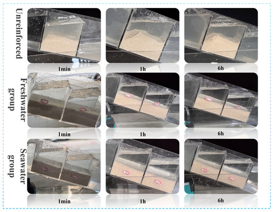 From the sectional views with different scouring intensities in Figure 7 and Figure 8, it can be seen that the scouring effect is pronounced within 1 h under the unreinforced condition. A concave surface is formed on the side close to the water flow wall surface. Due to the relatively strong scouring intensity of 15 W, it can be seen from the image that the concave surface is more profound, and cracks appear. After that, the changing effect gradually tends to be stable with time, and it reaches a stable state after 6 h, and there is not much change in the profile.