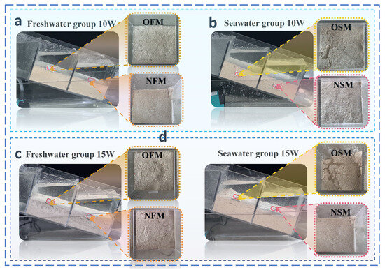 The reinforced groups are divided into a freshwater group and a seawater group. The samples in the freshwater group are OFM and NFM in sequence from left to right, and the samples in the seawater group are OSM and NSM in sequence from left to right. By comparing the 6 h scouring sectional images and front views under different scouring intensities and different bacterial solutions, as shown in Figure 7, Figure 8 and Figure 9, it can be observed that the scouring effects of NFM and NSM are better than those of OFM and OSM.