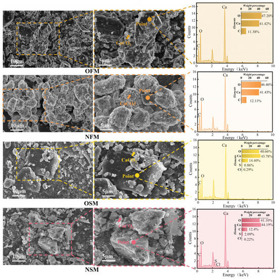 Figure 11 displays the XRD patterns of the bacterial precipitates. By comparing the crystal structures of the precipitates with standard reference cards, it was found that both OFM and NFM primarily consist of calcite. However, OFM contains a certain proportion of hexagonal calcite, while NFM contains trigonal calcite. Since the structure of trigonal calcite is more stable than that of hexagonal calcite, the precipitates in NFM exhibit higher thermodynamic and structural stability [60]. On the other hand, OSM contains some magnesium-containing calcite, while NSM contains some hexagonal calcite. Although magnesium-containing calcite is thermodynamically more stable, the superior cementation microstructure of the NSM group is mainly attributed to the combined advantages of precipitate density, uniform distribution, cementation strength, environmental adaptability, and precipitation rate. These factors collectively contribute to the more significant cementation effect of the NSM group.