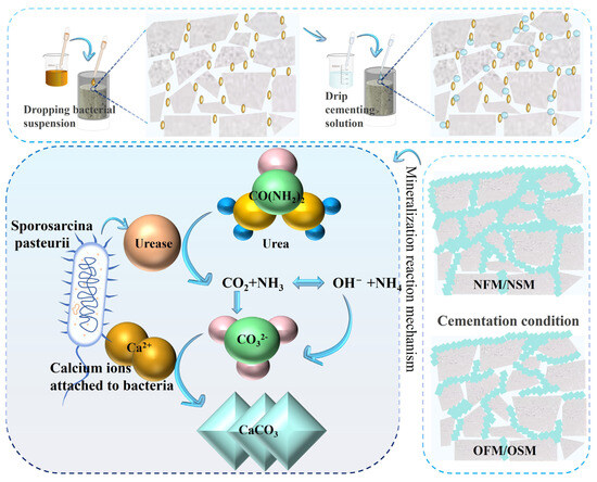 In recent years, with the rise of sustainable engineering concepts, microbially induced calcium carbonate precipitation (MICP) technology, as an environmentally friendly and cost-effective soil improvement method, has gradually attracted the attention of academia and engineering circles [26,27]. MICP technology utilizes microbial metabolic activities to induce calcium carbonate precipitation through the hydrolysis of urea [28]. The precipitates generated by MICP can significantly enhance the erosion resistance of sandy slopes by filling soil pores and cementing particles [29,30]. The specific reinforcement mechanism is as follows.