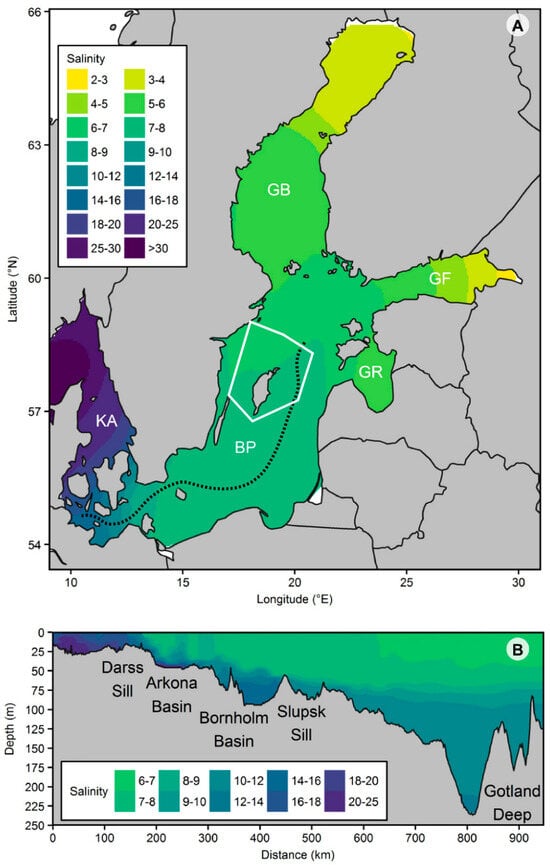 (A) Sub-surface salinity pattern indicating the extensive gradient within the Baltic Sea area (BP: Baltic Proper, GB: Gulf of Bothnia, GF: Gulf of Finland, GR: Gulf of Riga, KA: Kattegat). The dotted black line is a hypothetical transect; the white polygon indicates the study area; for details, see text. (B) Vertical interpolated salinity profiles along a hypothetical transect from the Belt Sea to the northern Baltic Proper. Data were obtained from IOW monitoring in 2013. Redrawn and edited with permission from Müller [] and the University of Rostock.