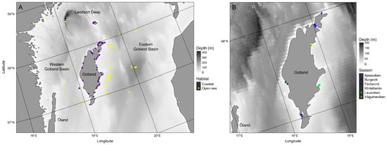 The study area covers the coastal waters of Gotland with sandy and rocky habitats, as well as the Eastern and Western Gotland Basins, located in the central Baltic Sea (Baltic Proper; Figure 1 and Figure 2A). On sandy bottoms, seagrass and freshwater plants grow, while on rocky bottoms, macroalgae thrive. The Eastern Gotland Basin is characterised by deeper waters with strong stratification, whereas the Western Gotland Basin (including the deepest point in the Baltic, the Landsort Deep) has more dynamic conditions with significant freshwater input [,]. It is these deep basins that hold water masses with higher salinity (>10); strongly reduced dissolved oxygen concentrations (<2 mg L−1); and increasing with residence time, elevated hydrogen sulphide concentrations below 150 m []. Conditions in deep basins may contrast sharply with surface water conditions (salinity typically between 6 and 8; Figure 1) and only change during deep-water renewal after massive inflow of North Sea water through the Danish Straits. Horizontal water movements in the Baltic are primarily driven by the wind, differences in air pressure, and differences between water mass densities. As the currents in the Baltic Sea depend on the weather, they vary; there are no permanent currents like in the world’s ocean basins. Southwestern winds are dominating the Baltic Sea area, and together with the rotation of Earth, counter-clockwise circular water movements in the Baltic can be observed []. For defining the study area, we used a polygon in open-access online data repositories (see below) oriented at landmarks like the northern tip of Öland and the Gotska Sandön island with the following coordinates: 58.4362, 19.3469; 58.8852, 17.6015; 57.3562, 17.0892; 56.8370, 18.1494; 57.2464, 20.1489; 58.0517, 20.6763 (Figure 1).