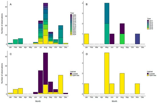 Phenology of major gelatinous zooplankton species observations around Gotland. (A,C) Aurelia aurita records (N = 122) split by year and habitat type, respectively; (B,D) Mertensia ovum (N = 9) split by year and habitat type, respectively. Habitat types: coastal (records within 1 km off the shoreline) and open sea (beyond the 1 km demarcation line).