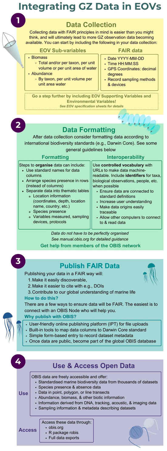 Steps for integrating gelatinous zooplankton (GZ) data into Essential Ocean Variables (EOVs) using Findable, Accessible, Interoperable, and Reusable (FAIR) principles. There are four key stages: (1) Data collection, ensuring that EOV sub-variables and FAIR data principles are adhered to right from the beginning; (2) formatting data to align with international biodiversity standards such as Darwin Core (DwC); (3) publishing FAIR data through, for example, the Ocean Biodiversity Information System (OBIS) to ensure global access; and (4) using and accessing open data via platforms like OBIS and SeaLifeBase. These steps will enhance data interoperability and contribute to a more holistic understanding of global marine ecosystems. DOI = Digital Object Identifier, IPT = Integrated Publishing Toolkit, URL = Uniform Resource Locator.