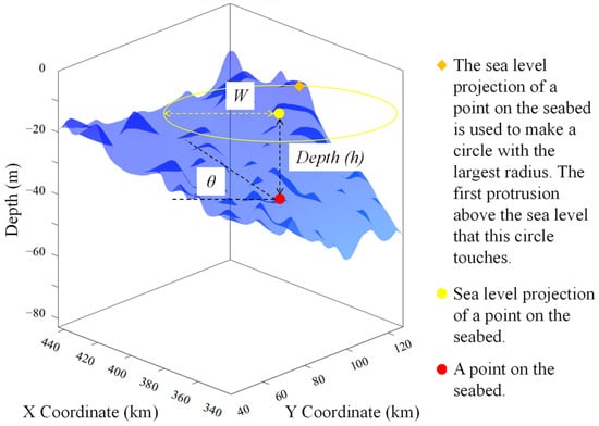 Seabed geographic features serve as critical indicators for characterizing the natural marine environment. Among these, water depth is the most significant parameter, directly influencing the vertical distribution of water temperature, flow velocity, and hydrodynamic forces. Stratification within the water column exhibits distinct dynamic behaviors in shallow versus deep regions [11]. The slope represents the inclination of the seabed surface. Regions with steeper slopes often experience accelerated flow velocities and intensified erosion effects, highlighting their role in shaping hydrodynamic conditions and sediment transport [12]. The sea surface width, which measures the openness of the ocean surface, is defined as the distance between a specific study location and its nearest protruding sea surface obstacle. The sea surface width (W) is defined as the minimum horizontal distance from a given study point to the nearest protruding barrier (e.g., an island or coastal outcrop) at the sea surface. This parameter serves as an indicator of the degree of exposure of the water body to open sea conditions. A greater sea surface width suggests that the corresponding region is more exposed, thereby allowing wind stress to have a more pronounced effect on the water flow. Although termed ‘Width’, it is used in our model to capture the hydrodynamic influence of the local marine topography on the distribution of wind−driven forces. In regions with no significant protruding obstacles (e.g., open sea areas to the north or west), the sea surface width may exhibit abrupt transitions along vertical or horizontal lines. This phenomenon arises naturally from the uniform absence of obstacles in those directions, such as elevated points visible above the water (e.g., the yellow markers in Figure 2). This feature significantly influences the intensity of wind stress, tidal interactions, and fluid motion, shaping local hydrodynamic processes [13]. A representative seabed topography (Figure 2) was randomly selected to illustrate these geographic features. Collectively, these parameters—water depth, slope, and sea surface width—play a pivotal role in determining material transport and the dynamic behavior of the marine environment.