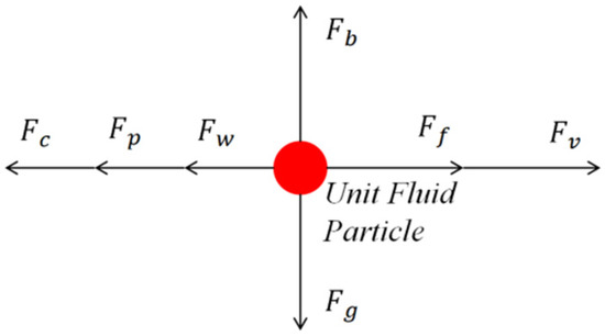 Viscous force originates from the internal viscosity of the fluid, creating shear stress due to velocity gradients. For three−dimensional motion, it is represented by , as in Equation (1). In vertical motion, it is commonly expressed as , where is the dynamic viscosity coefficient, and represents the velocity gradient with respect to depth. The viscous force intensifies with larger velocity gradients.