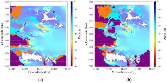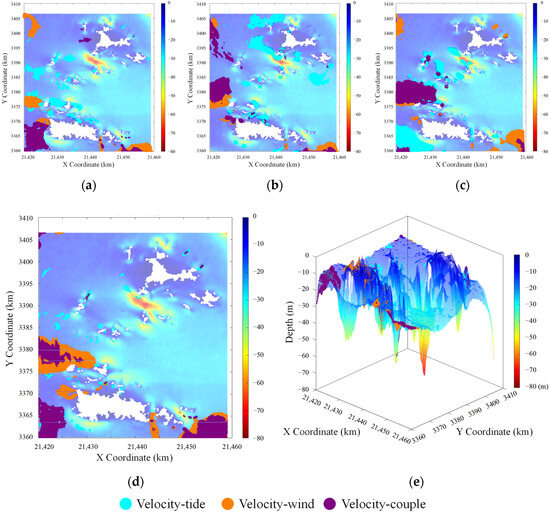 The Zhejiang coastal area, known for its intricate terrain featuring numerous islands, bays, and complex seabed topography, poses unique challenges. The region experiences irregular semi−diurnal tides with significant tidal ranges, which are particularly pronounced during typhoon−induced storm surge events. A finer−scale seabed grid was applied for the Qushan and Shengsi Islands, with a resolution of 100 m. These islands are located in the northern part of Zhejiang Province’s Zhoushan Archipelago, near the outer edge of the Yangtze River estuary. The waterways in this area are narrow, characterized by complex tidal currents, and water depths gradually transition from shallow coastal zones to the open sea, ranging from 0 to 80 m. The seabed topography is dominated by numerous islands, reefs, and shoals (Figure 1b), resulting in highly intricate hydrodynamic conditions (Figure 1c). For better visualization, the 3D seabed map adopts a perspective view with the x− and y−axes spanning approximately 40 km and 50 km, respectively, while the depth is limited to a maximum of 80 m. Note that the visual scaling prioritizes clarity over true proportions, enabling a clearer depiction of the seabed’s complexity.
