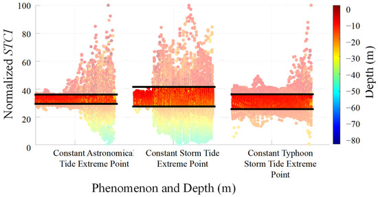 The STCI exists across the range of 0–100, but only within the range of (25, 45) do “constant astronomical tides”, “constant storm surges”, or “constant typhoon storm surge coupled extreme points” occur. Outside this range, STCI values rarely exhibit the characteristic topography of any type of extreme flow velocity throughout an entire typhoon event (85% of the time).