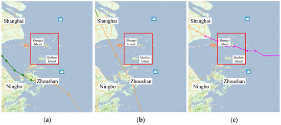 Typhoons with similar paths (red box represents the study area). (a) Typhoon In−fa; (b) Typhoons Muifa; (c)Typhoon Bebinca. The red box is the small-scale sea area in Delft 3D numerical model, and the dotted lines are the paths of different typhoons.