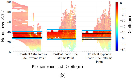 The constant extreme points of astronomical tides exhibit a concentrated trend in the STCI values, primarily within the lower range of 30–36. This indicates that in regions dominated by astronomical tides, the influence of tides on STCI is relatively stable and uniform, suggesting that the extreme flow velocity points for astronomical tides typically occur in relatively fixed and regular topographic conditions. As shown in Figure 6d, the extreme points for astronomical tides are primarily found in mid−depth regions with larger sea surface widths, where their distribution is relatively scattered. In contrast, the constant extreme points of storm surges display a broader range of STCI values. As water depth increases, the STCI values become more dispersed, reflecting the more intense and irregular impact of storm surges on STCI due to their non−periodic and unpredictable nature. The extreme points of typhoon storm surges align with the trends shown in Table 2 and Table 3, resembling the pattern of astronomical tides more closely. These points are primarily located in shallow water regions, with STCI values similar to those of astronomical tides, and overall fall between the other two types of flow velocities.