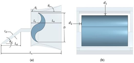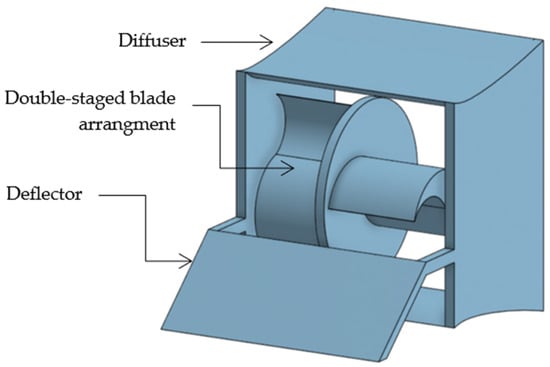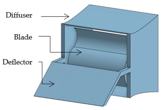 A three-dimensional computer-aided design (CAD) model of an optimised drag-based Savonius HKT is used for numerical setup validation. The model is developed based on previous works by Ng et al. []. It consists of a two-blade rotor profile, a deflector, and a diffuser to improve the local flow velocity. The turbine geometry is shown in Figure 2, while the geometrical parameters are labelled in Figure 3 and listed in Table 1. The turbine geometry adopts the design parameters from Maldar et al. [].