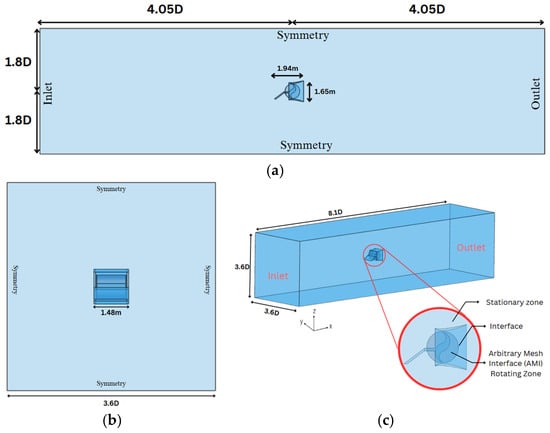 The computational domain is defined through domain size analysis. A single-stage HKT model developed by Ng et al. [] is used to validate the numerical setup. To minimize blockage effects while ensuring computational efficiency, five domain configurations are tested. Each configuration is expressed in terms of turbine diameter (D), with each subsequent size reduced by 10%. The tested domain dimensions are presented in Table 2.