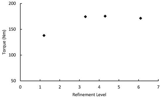 Table 5 presents the details and results of the mesh density analysis. Four refinement levels (RLs), ranging from coarse to fine mesh, are tested. The torque output increases significantly from RL 1 to RL 2. The relative change reduces after RL 2, and a stable torque value is observed. A slight drop in torque is noted at RL 4. This behaviour is attributed to improved resolution of local flow separations and wake dissipation. As the mesh becomes finer, the solver captures smaller-scale turbulence structures and boundary layer losses more accurately. This leads to a marginal decrease in predicted torque compared with intermediate mesh levels, which may slightly overestimate performance due to residual numerical diffusion. This outcome is consistent with expected CFD behaviour and does not indicate a loss of accuracy. The torque values remain stable from RL 2 onward. Therefore, it is selected for all subsequent simulations. This level provides sufficient resolution near the turbine while maintaining manageable computational costs. Torque performances across RL 1 to RL 4 are shown in Figure 7.