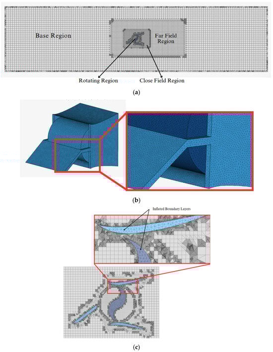 Meshing of RL 2. (a) Cross section showing volume region refinements: base, far-field, close-field, and rotating zone. (b) Surface refinement applied to the turbine and diffuser to define solid boundaries and enable accurate wall interaction. (c) Inflated boundary layers formed around the turbine blades and diffuser surfaces. No flow is solved inside the solid regions.