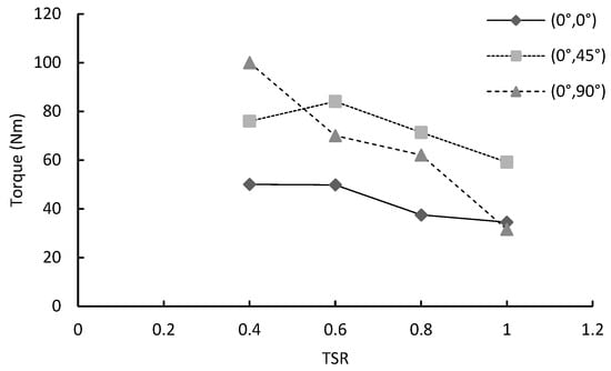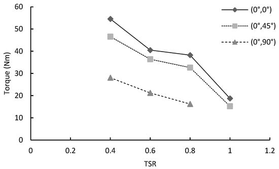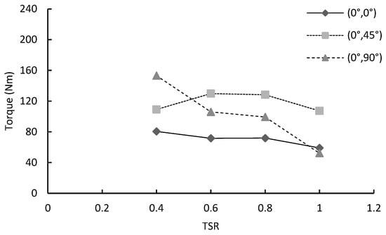 - Torque output decreased with increasing TSR for all cases. The (0°, 0°) configuration shows higher torque at high TSRs, while the (0°, 45°) configuration performed effectively at mid-TSRs. The (0°, 90°) configuration performed the least effectively;