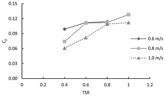 The torque coefficient (Ct) is evaluated for each blade configuration at three flow velocities (0.6 m/s, 0.8 m/s, and 1.0 m/s). Figure 16, Figure 17 and Figure 18 illustrate the variation of Ct with TSR for the (0°, 0°), (0°, 45°), and (0°, 90°) configurations.