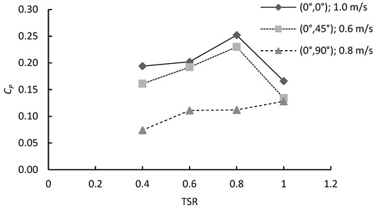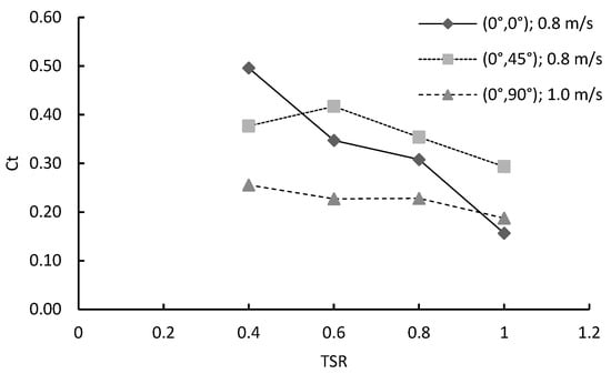 The Ct trends further support the Cp findings. The (0°, 0°) configuration records the highest Ct at all velocities, especially at 0.8 m/s, indicating strong and consistent rotational performance. The (0°, 45°) configuration performs well at mid-TSRs and higher flow rates. The (0°, 90°) configuration yields the lowest Ct across all conditions.