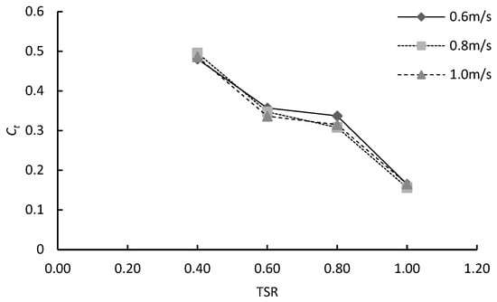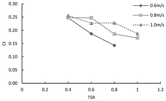 Ct variation with TSR for (0°, 0°) blade configuration at flow velocities of 0.6 m/s, 0.8 m/s, and 1.0 m/s.