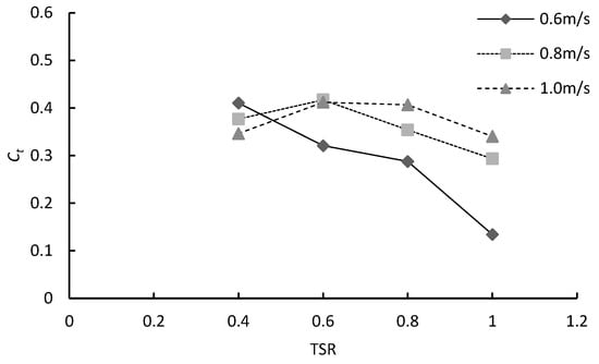 Ct variation with TSR for (0°, 45°) blade configuration at flow velocities of 0.6 m/s, 0.8 m/s, and 1.0 m/s.