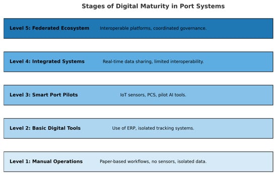 Visual representation shows the progressive transition from manual, fragmented port operations to a fully integrated and interoperable digital ecosystem. Each stage reflects a qualitative leap in both technological deployment and strategic alignment.