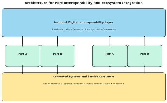 The conceptual model in Figure 2 shows a federated digital infrastructure linking autonomous port authorities through a shared interoperability layer. This layer enables coordinated interaction with urban systems, logistics platforms, public institutions, and academic stakeholders [10].
