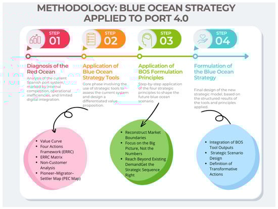 This study adopted a conceptual and strategic methodology based on the framework of the Blue Ocean Strategy (BOS), developed by Kim and Mauborgne [41], as a structured approach to redefining the Spanish port system under the principles of Port 4.0. The method was applied sequentially in four distinct stages: diagnosis, application of BOS tools, strategic formulation, and the construction of a new operational model (Figure 3).