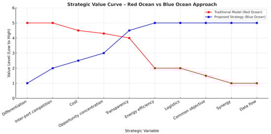 Figure 4 shows the resulting value curve. The Red Ocean strategy revealed a system heavily focused on competition, cost fragmentation, and limited collaboration. In contrast, the Blue Ocean strategy shifted the focus toward energy efficiency, transparency, synergies, data flow, and a unified logistics chain, suggesting a reconfiguration of the sector’s value architecture.