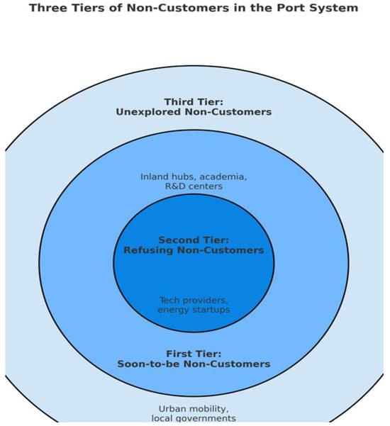 - Non-Customer Analysis identifies users and stakeholders not currently engaged by the port ecosystem—such as urban actors, smart mobility services, or digital platform providers—and explores how they can be incorporated into the new value proposition.