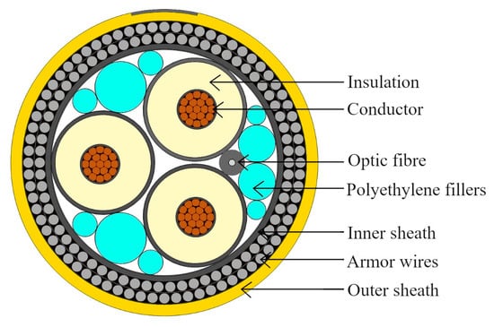 Figure 1 shows an exemplary cross-section of a power cable, including the conductors, optical fibers, insulation, and any shielding or protective layers. The conductor area determines the current capacity, with larger areas allowing higher currents. Power cables commonly have several layers of armor to define axial, bending, and torsional stiffness. Smaller diameter cables of lower current rating do not necessarily have to be equipped with armor, reducing costs and facilitating the installation and maintenance; see Ringsberg et al. [48].