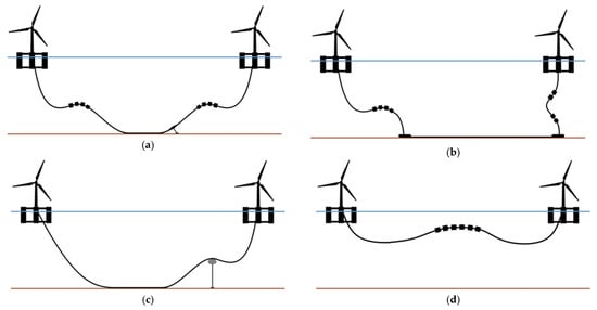 Ikhennicheu et al. [45] and Clausen and D’Souza [54] provided overviews of overall configurations successfully implemented for O&G risers, offloading hoses, and umbilicals. Figure 2 shows several configurations that can be used for dynamic power cable configurations of FOWTs.